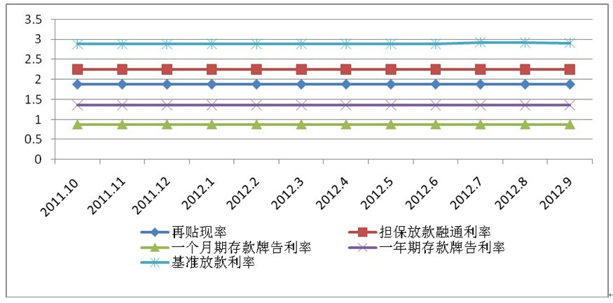 4.銀行業(yè)利率保持穩(wěn)定。再貼現(xiàn)率、擔保貸款融通利率一直維持在2011年的平均水平上,分別為1.875%和2.25%。以臺灣銀行、合作金庫銀行、第一商業(yè)銀行、華南商業(yè)銀行和彰化銀行五大行庫為例,一個月期存款牌告利率和一年期存款牌告利率也分別保持了穩(wěn)定水平,分別為0.88%和1.36%,基準貸款利率則有所上調(diào),2012年1月略有上調(diào),7月再上調(diào)至2.927%,9月回調(diào)至2.915%。