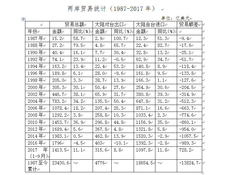 在投資帶動下,兩岸貿(mào)易快速發(fā)展。1987年,兩岸貿(mào)易總額僅為15.2億美元,現(xiàn)在每年超過1700億美元。大陸是臺灣最大的出口市場、最大的貿(mào)易順差來源地,三十年來兩岸貿(mào)易額累計達23430.6億美元,順差額累計13824.7億美元。