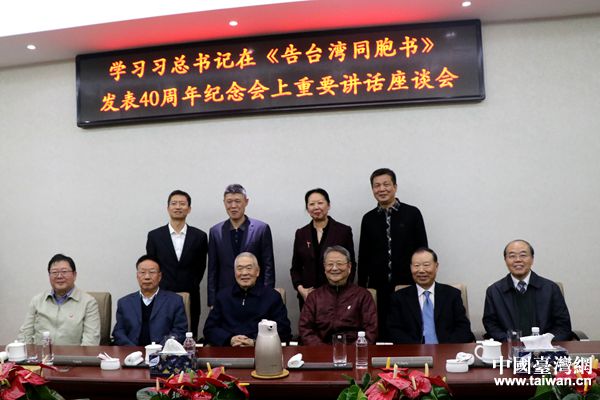 中國臺灣網(wǎng)1月7日北京訊(記者 李杰)今天下午,全國臺灣研究會在新會址北京文津國際公寓3層會議室,召開“學(xué)習(xí)貫徹習(xí)近平總書記在《告臺灣同胞書》發(fā)表40周年紀(jì)念會上重要講話精神座談會”。會議由全國臺灣研究會執(zhí)行副會長王升主持,現(xiàn)任及前任會領(lǐng)導(dǎo)汪毅夫、孫亞夫、李亞飛、王在希、許世銓、周志懷,以及常務(wù)副秘書長楊幽燕、副秘書長鄭慶勇、嚴(yán)峻參加座談并發(fā)言。