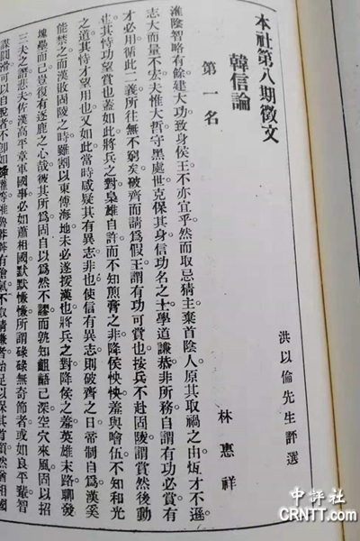 林惠祥《韓信論》第1頁。(圖片來源:香港中評(píng)社)