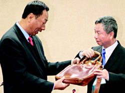 臺灣前“衛(wèi)生署長”楊志良上網(wǎng)拍賣舊公文包,最后被鴻海集團董事長郭臺銘以500萬元新臺幣結(jié)標(biāo)。一方是臺當(dāng)局聲望最高的前“閣員”,另一方是臺灣首富,自然吸引島內(nèi)各界關(guān)注。輿論認為:楊志良應(yīng)可感到安慰,在達到500萬得標(biāo)價之前的每一筆出價,都代表著平民百姓對于“從沒見過這樣做官的”之敬意。 |