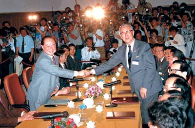 1993年4月27日,首次“汪辜會談”前汪道涵(左)與辜振甫握手。