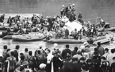 本報(bào)記者于中午12時(shí)許趕到失事現(xiàn)場(chǎng)。事發(fā)地點(diǎn)在臺(tái)北和新北市的交界處,河兩旁是寬闊的空地、高架橋和高速公路。從高處可以看到,失事飛機(jī)只有小部分機(jī)身露出水面,且斷成兩截。10數(shù)艘橡皮艇圍繞在旁,搜救人員從水面上一個(gè)機(jī)艙門進(jìn)入救人。