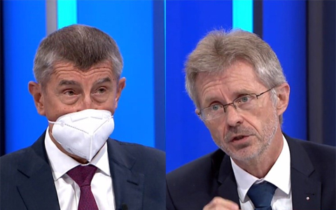 捷克總理巴比什與參議長(zhǎng)維特齊在電視節(jié)目上辯論。(圖片來源:網(wǎng)絡(luò))