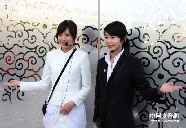 “歡迎來到臺灣館!”甜美和善的笑臉,悅耳親切的語調(diào),儀態(tài)萬方的身姿,舉手投足無不展現(xiàn)“臺式”待客之道。游客來到臺灣館,這第一景就是享受“領(lǐng)航員”的優(yōu)美外形和優(yōu)質(zhì)服務(wù)。