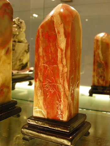 巴林石是一種葉臘石,因產(chǎn)于赤峰市巴林右旗而得名。石質(zhì)中含有多種化學(xué)成份,質(zhì)地潤澤細(xì)膩,斑斕多彩,微呈半透明,硬度適中,脆軟相間,據(jù)專家測定,巴林石色澤、成份與我國傳統(tǒng)雕刻原料壽山石、青田石齊名,在韓國、日本、印尼的葉臘石之上,可與寶石、瑪瑙媲美,是雕刻、鑲嵌的最佳原料,是中國三大采石基地之一。以巴林石為基礎(chǔ)建立的巴林奇石館,是巴林石品質(zhì)和藝術(shù)精品的集中展示地,巴林奇石館的主要特點(diǎn)是:一,品種全、花色多。館內(nèi)陳列著雞血石、黃凍石、牛角凍、羊脂凍、水晶凍、瑪瑙凍、五彩凍、桃花凍、金黃料、紅花石、五彩石、畫石和高嶺石等巴林石優(yōu)質(zhì)礦石20多個(gè)品種,花色近百種。其中雞血石和畫石最引人注目。二是巴林石作品題材廣泛,造型優(yōu)美,形象生動(dòng)。雕件作品有反映草原特點(diǎn)的馬、牛、羊、駝,還有仿古器物,亭閣樓臺(tái),花鳥蟲魚,詩詞書畫等大量精品佳作。三是雕刻手法精湛,繼承傳統(tǒng),推陳出新。巴林石雕在繼承傳統(tǒng)雕刻藝術(shù)的基礎(chǔ)上,借鑒吸收了國畫的工筆白描手法以及玉雕的色彩選擇,骨雕的鏤空技世,發(fā)揮鑿、鏟、雕、剔、鉆、拉等工藝精心雕刻,使創(chuàng)造出的作品形體清晰,層次分明,玲瓏剔透,栩栩如生。