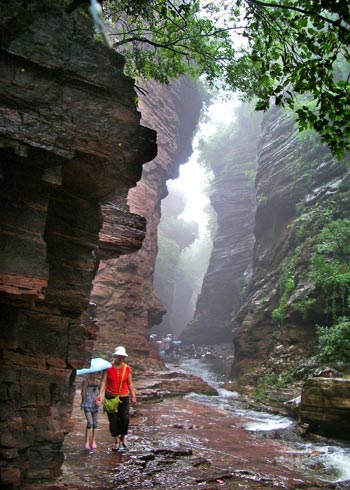 龍?zhí)洞髰{谷是一條由紫紅色石英砂巖經(jīng)流水追蹤下切形成的U型峽谷,全長12公里,谷內(nèi)嶂谷、隘谷呈串珠狀分布,云蒸霞蔚,激流飛濺,紅壁綠蔭,懸崖絕壁,不同時(shí)期的流水切割、旋蝕,磨痕十分清晰,巨型崩塌巖塊形成的波痕大絕壁國內(nèi)外罕見。景區(qū)的六大自然謎團(tuán)(水往高處流、佛光羅漢崖、巨人指紋、石上天書、蝴蝶泉、仙人足跡)七大幽潭瀑布(五龍?zhí)、龍涎潭、青龍(zhí)、黑龍(zhí)丁⑴P龍?zhí)、陰陽潭、蘆葦潭)八大自然奇觀(絕世天碑、石上春秋、陰陽潭甕谷、五代波紋石、天崩地裂、通靈巷谷、喜鵲迎賓、銀鏈掛天)令人驚嘆不已,流連忘返。紅巖絕壁,飛瀑幽潭,狹溝深谷,奇石綠蔭,組成世界上罕見的山水畫廊。