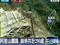 據(jù)臺(tái)灣東森電視臺(tái)報(bào)道,在阿里山公路84公里處,因山體滑坡道路已經(jīng)完全崩塌形成斷路。在坍塌公路附近的阿里山小火車鐵路,因路基掏空也發(fā)生了塌陷。當(dāng)?shù)匾蚬疯F路斷路,對(duì)外交通已經(jīng)斷絕。此外,阿里山部分房屋也遭受水淹,最深曾達(dá)2米。