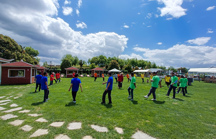 經(jīng)過多個方案比對,本次五一慰問活動采取“慰問+團建”的方式進行,全程由直管部職工自行組織完成。直管部在為項目一線同事送去節(jié)日慰問的同時,還組織開展了具有趣味性的團建活動,使廣大干部職工既能感受到組織關(guān)懷,又能在工作之余放松心情、增進溝通,體會團隊協(xié)作的強大合力?;顒舆x址位于麗江市拉市鎮(zhèn)拉市海畔,山清水秀,花紅柳綠,景色宜人。在主持人的帶領(lǐng)下,參加活動的干部職工領(lǐng)取不同顏色的隊服,由直管部領(lǐng)導(dǎo)班子帶隊組成五支隊伍,進行了“急速成團”“氣球搬運工”“占座王”“你比我猜”和“蘿卜蹲”五輪小游戲。一邊欣賞拉市海秀麗的景色,一邊通過隊員之間的默契配合贏得游戲勝利,綠茵之間充滿了大家的歡聲笑語。