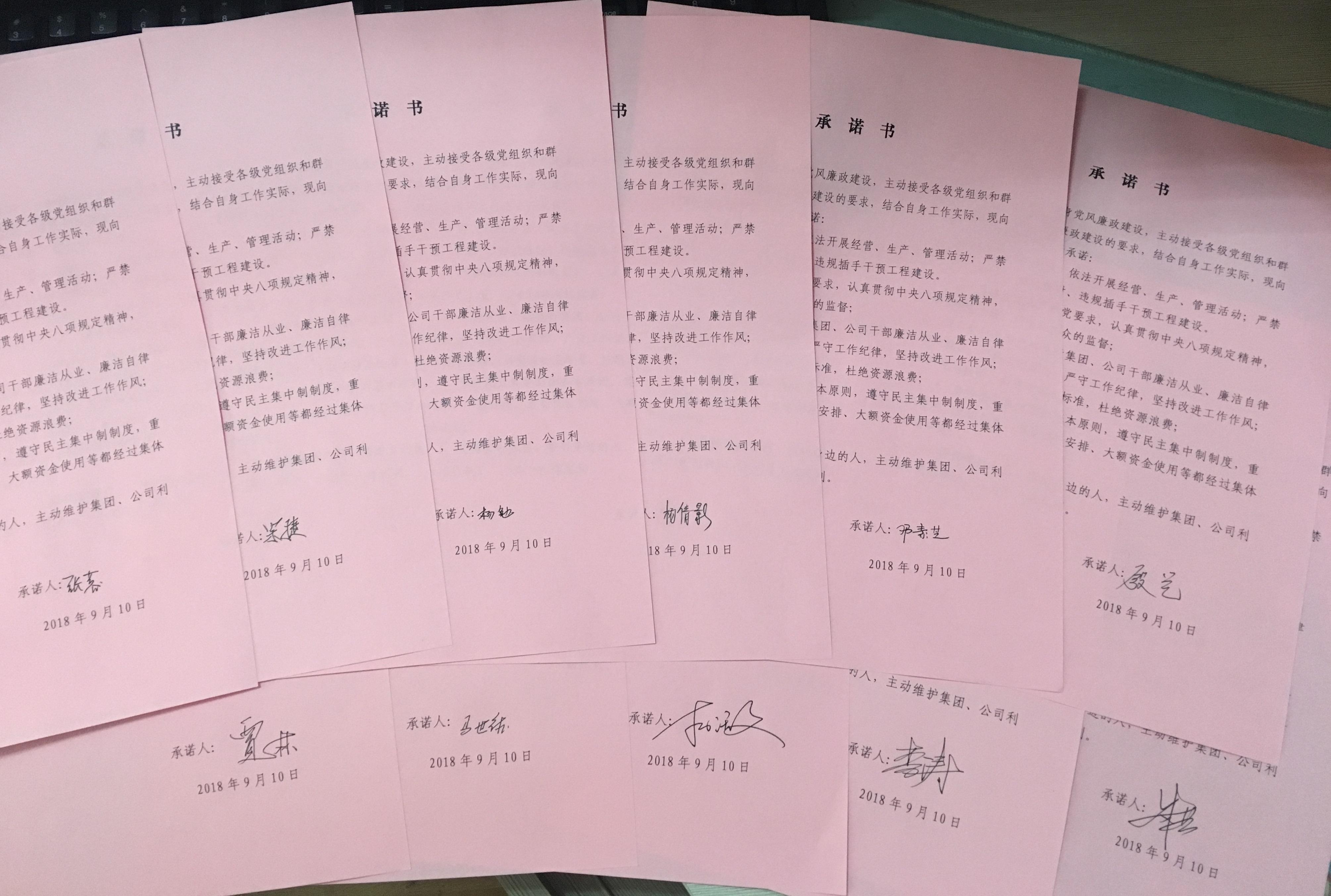 9月10日,五〇四直管部黨支部為進一步強化黨風廉政建設,增強領導干部、業(yè)務骨干的廉潔從業(yè)意識,,組織領導班子成員、項目經(jīng)理及科室負責人共計簽訂“承諾書”17份。直管部領導干部及業(yè)務骨干向黨組織和廣大職工群眾做出公開承諾:帶頭遵紀守法,依法開展經(jīng)營、生產(chǎn)、管理活動,嚴格落實從嚴治黨要求,認真貫徹中央八項規(guī)定及其實施細則精神,堅持帶頭執(zhí)行集團、公司干部廉潔從業(yè)、廉潔自律相關規(guī)定,堅持改進工作作風,貫徹…