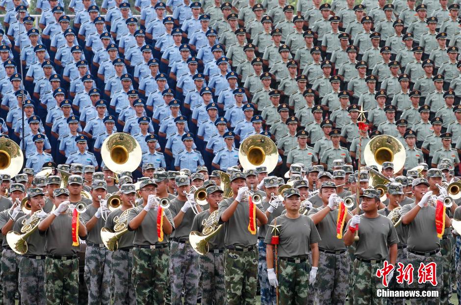 解放軍聯(lián)合軍樂團(tuán)團(tuán)長鄒銳日前透露,聯(lián)合軍樂團(tuán)將在9月3日閱兵當(dāng)天第一個進(jìn)入閱兵場地,為紀(jì)念大會和閱兵提供“背景音樂”。聯(lián)合軍樂團(tuán)由來自全軍55支專業(yè)、業(yè)余軍樂團(tuán)(隊(duì))的1000多名成員組成,擔(dān)負(fù)紀(jì)念大會開始全部合唱伴奏和閱兵全過程的音樂演奏任務(wù)。解放軍聯(lián)合軍樂團(tuán)訓(xùn)練場景。