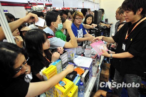 八月二十一日,香港一連四日的電腦通訊節(jié)在灣仔會(huì)展揭幕。有參展商以低于市場價(jià)格促銷電子產(chǎn)品,吸引不少人光顧。 中新社發(fā) 譚達(dá)明 攝