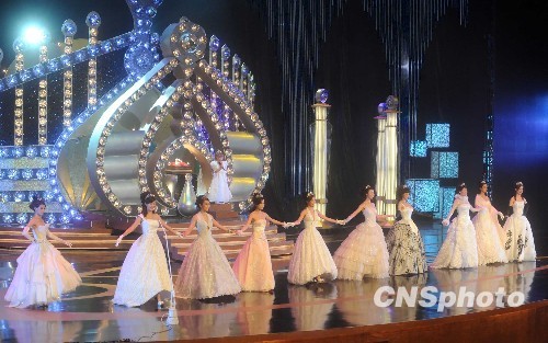 八月二十二日晚,二零零九年香港小姐競(jìng)選決賽在香港紅磡體育館隆重舉行。十位候選佳麗在風(fēng)靡全球的女童星Connie Talbot歌聲中出場(chǎng)揭開(kāi)選美賽夜序幕。 中新社發(fā) 鄧慶樂(lè) 攝