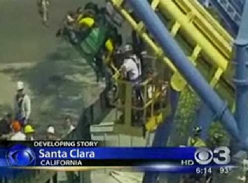 事故發(fā)生在加州圣塔克拉拉市的美國(guó)主題公園(Great AmericaThemePark)。據(jù)該市消防部門官員奧吉·威德曼介紹,當(dāng)?shù)貢r(shí)間中午12點(diǎn)15分,過山車載著興奮的游客向整個(gè)軌道的最高點(diǎn)進(jìn)發(fā),“就在即將要上爬的時(shí)刻突然停了下來”。