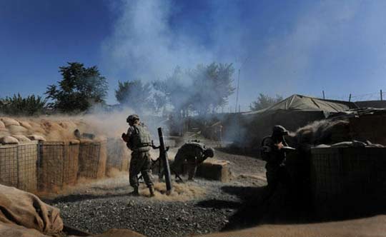 20日,阿富汗的盧格爾省至少有6個投票中心遭到武裝分子襲擊。圖為美軍士兵向襲擊投票中心的武裝分子發(fā)射迫擊炮。