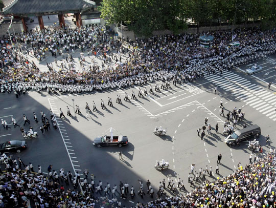 據(jù)報道,從遺體告別儀式舉行地到東橋洞私宅、首爾市廳前以及銅雀洞國立墓地的路上,云集數(shù)十萬人,送金大中最后一程。