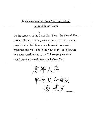 潘基文在用英文發(fā)表的賀詞中說:“值此農(nóng)歷新年‘虎年’到來之際,我謹向中國人民致以最熱烈的祝賀。祝愿中國人民在新的一年里更加幸福安康。我期待著中國人民在新的一年里為世界和平與發(fā)展作出更大貢獻!