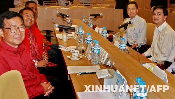 3月29日,泰國(guó)總理阿披實(shí)(右一)在曼谷會(huì)見“紅衫軍”代表。泰國(guó)總理阿披實(shí)與“紅衫軍”代表當(dāng)晚舉行的第二輪談判仍未能就解散國(guó)會(huì)下議院的時(shí)間達(dá)成協(xié)議。新華社/法新
