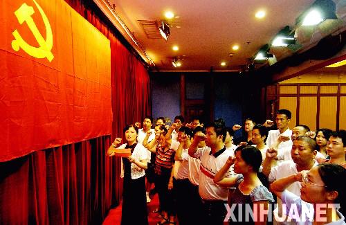 6月29日,加入黨組織的福州市非公企業(yè)新黨員在黨旗下宣誓。當(dāng)日,福州市100名非公企業(yè)優(yōu)秀青年光榮加入黨組織。今年以來,福建省加強非公企業(yè)黨組織建設(shè),全省8708家規(guī)模以上企業(yè)全部建立黨組織,一批優(yōu)秀青年加入到黨組織的行列,成為經(jīng)濟建設(shè)和社會發(fā)展的生力軍。 新華社記者 張國俊 攝