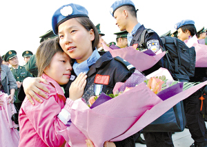 上午8時整,一架中國國際航空公司CF6-80C2專機(jī)穩(wěn)穩(wěn)地降落在白云機(jī)場停機(jī)坪,一面鮮紅的標(biāo)有“中國維和警察防暴隊(duì)”旗幟首先從機(jī)艙門飄出,緊接著,95名胸前佩戴聯(lián)合國“和平勛章”的維和隊(duì)員依次走下懸梯,已經(jīng)等候多時的家屬、戰(zhàn)友們立即沖了上去,當(dāng)維和隊(duì)員王勝抱起4歲的兒子王子天時,實(shí)在忍不住紅了眼圈,因?yàn)樯洗伪饍鹤訒r,這個小家伙才3歲。