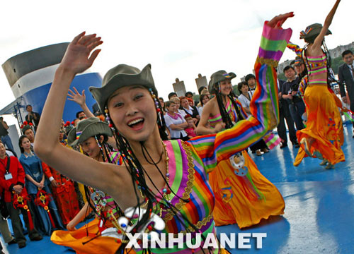 9月5日,在俄羅斯首都莫斯科舉行的“伏爾加河藝術(shù)之旅”起航儀式上,中國演員在游船“茹科夫”號上表演歌舞!胺鼱柤雍铀囆g(shù)之旅”是今年在俄羅斯舉辦的“中國文化節(jié)”的重要內(nèi)容之一。 新華社記者沈伯韓攝