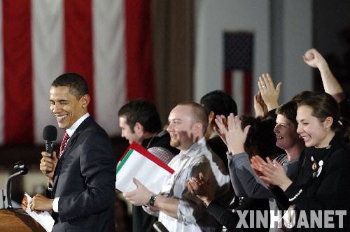 1月2日,在美國(guó)中西部的艾奧瓦州首府得梅因,民主黨總統(tǒng)競(jìng)選人奧巴馬發(fā)表競(jìng)選演講。艾奧瓦州將于1月3日舉行2008年美國(guó)總統(tǒng)選舉首場(chǎng)預(yù)選,這是今年美國(guó)大選的第一場(chǎng)“前哨戰(zhàn)”,對(duì)于以后的選舉有“風(fēng)向標(biāo)”和“晴雨表”的作用,格外引人關(guān)注。 新華社記者張巖攝