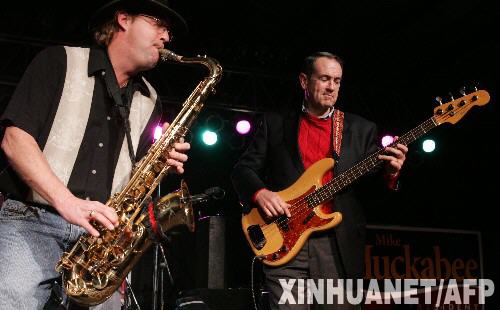 1月1日,在美國(guó)艾奧瓦州的得梅因,美國(guó)共和黨總統(tǒng)競(jìng)選人邁克·赫卡比(右)在競(jìng)選集會(huì)上表演。美國(guó)總統(tǒng)選舉黨內(nèi)初選即將于1月3日在艾奧瓦州開(kāi)鑼,民主黨和共和黨將分別舉行基層黨員會(huì)議,推舉參加高級(jí)黨員會(huì)議的代表,以選擇本黨總統(tǒng)候選人。 新華社/法新