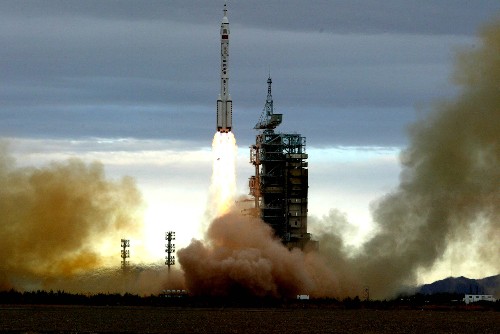 2005年10月12日,神舟六號(hào)在酒泉衛(wèi)星發(fā)射中心發(fā)射成功。 新華社記者趙建偉攝