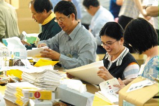 中國(guó)臺(tái)灣網(wǎng)1月20日消息 據(jù)臺(tái)灣《聯(lián)合晚報(bào)》報(bào)道,臺(tái)灣地區(qū)第7屆“立委”選舉與“公投”后天投票,各縣市選票今天送抵各區(qū)及各鄉(xiāng)鎮(zhèn)市公所。全臺(tái)各縣市中,第一大縣臺(tái)北縣共有282萬(wàn)多名選民,共印制1145萬(wàn)多張選票,全臺(tái)最多;臺(tái)北市其次,共812萬(wàn)張;高雄市選票也有462萬(wàn)張選票,都創(chuàng)下歷次選舉之最紀(jì)錄,若換算成重量,光是北北高三地的選票就重達(dá)65噸,相當(dāng)驚人。