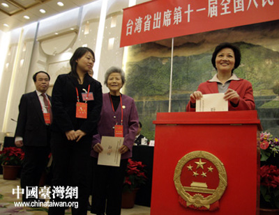 選舉結(jié)束后,全國人大常委會副委員長、秘書長盛華仁,中共中央統(tǒng)戰(zhàn)部部長杜青林等看望了當(dāng)選代表。盛華仁代表全國人大常委會和吳邦國委員長,向當(dāng)選代表表示熱烈祝賀。他說,全國人大代表既享有很高的榮譽(yù),也肩負(fù)著重大的責(zé)任。各位當(dāng)選代表,即將成為最高國家權(quán)力機(jī)關(guān)的組成人員,參與行使最高國家權(quán)力。歷屆臺灣省全國人大代表都為發(fā)展兩岸關(guān)系,促進(jìn)祖國和平統(tǒng)一大業(yè)做出了積極貢獻(xiàn)。臺灣省第十一屆全國人大代表要充分發(fā)揮自己的優(yōu)勢和影響,為促進(jìn)兩岸關(guān)系的和平發(fā)展發(fā)揮更大的作用。