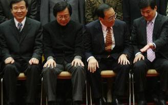 臺當局“行政院長”張俊雄(右二)率總辭后的全體“閣員”拍畢業(yè)照留念。臺灣“中央社”記者蘇圣斌攝