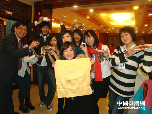 來(lái)自臺(tái)灣花蓮教育大學(xué)的林鈺堂剛剛結(jié)束哈爾濱的行程來(lái)到北京,第一次踏上大陸這片神奇的土地讓他有種說(shuō)不出的激動(dòng)!氨本└稍、寒冷又清新的空氣都讓我們感到欣喜,那種感覺(jué)很微妙。聞名不如見(jiàn)面,大陸之行不僅讓我們?cè)鲩L(zhǎng)了閱歷,更結(jié)交了朋友! 與林鈺堂同校的女孩陳珈蓁對(duì)任何事物都感到好奇和驚喜,她興奮地學(xué)習(xí)卷烤鴨的技巧,拉著記者照相,并與新朋友交換聯(lián)系方式,渴望交流與溝通的迫切心情溢于言表。