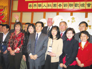 中新網(wǎng)2月17日電 據(jù)美國《僑報》報道,2008年第四屆金山灣區(qū)兩岸三地各界華人社團春節(jié)聯(lián)歡會2月15日(大年初九)晚在南灣舉行。近700位來自北加州地區(qū)的華人華僑與當?shù)夭糠莩鞘械拿襁x官員,及中國駐舊金山總領(lǐng)館官員等嘉賓出席。
