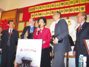 世界抗日戰(zhàn)爭史實維護聯(lián)合會在聯(lián)歡晚會上,為拍攝《南京》紀錄片導(dǎo)演古特塔格(Bill Guttentag)頒發(fā)了“人道獎”,以表達華人社團對這位導(dǎo)演追求公理正義的敬意和感謝。著有《南京大屠殺》一書的已故知名華裔女作家張純?nèi)绺改敢采吓_向這位導(dǎo)演頒發(fā)感謝獎狀。