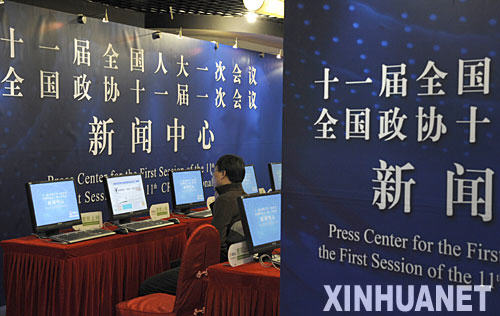 2月27日,新聞中心提供寬帶上網(wǎng)服務(wù)。 十一屆全國(guó)人大一次會(huì)議和全國(guó)政協(xié)十一屆一次會(huì)議將分別于3月5日和3月3日在北京開幕。記者獲悉,設(shè)在北京西長(zhǎng)安街北側(cè)梅地亞中心的兩會(huì)新聞中心已于26日正式啟動(dòng),中心工作人員開始接待和安排中外記者采訪會(huì)議。 新華社記者 戴旭明攝