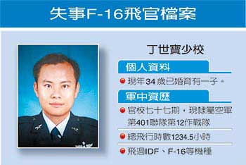 中新網(wǎng)3月5日電 據(jù)臺灣《聯(lián)合報》報道,臺灣空軍少校飛行員丁世寶昨晚駕駛F-16戰(zhàn)機(jī)在花蓮?fù)夂J?lián)。臺空軍初步分析,很可能已經(jīng)墜機(jī)。