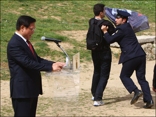 鬧事者被希臘警察制服,并被帶離現(xiàn)場(chǎng),北京奧組委主席劉淇繼續(xù)沉穩(wěn)莊嚴(yán)地發(fā)表講話。