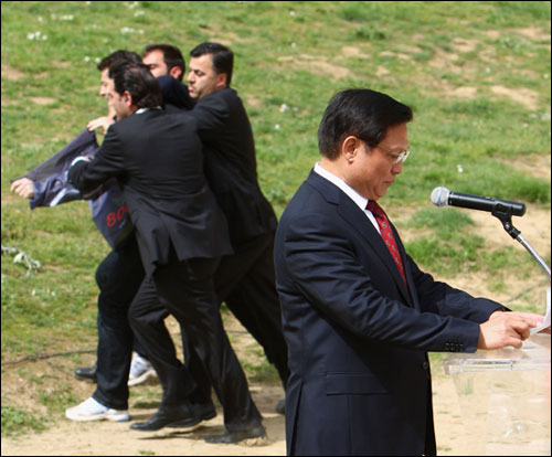 上午十一點(diǎn),圣火采集儀式正式開始。陽光明媚,暖風(fēng)習(xí)習(xí),古競(jìng)技場(chǎng)內(nèi)綠草茵茵,春花爛漫,一切都顯得生機(jī)盎然,現(xiàn)場(chǎng)氣氛神圣而祥和。儀式進(jìn)行了十幾分鐘,北京奧組委主席劉淇上前開始發(fā)表講話,這時(shí),記者看見來賓席上突然躥出一個(gè)人,他奔向劉淇,在劉淇身旁展開一個(gè)橫幅,另有兩個(gè)顯然是他同伙的人也加入進(jìn)來發(fā)難。但他們迅即被在場(chǎng)的希臘警察制服,并被帶離現(xiàn)場(chǎng)。在這一不到兩分鐘的過程中,劉淇繼續(xù)沉穩(wěn)莊嚴(yán)地發(fā)表講話,未受到任何影響。當(dāng)劉淇主席講話結(jié)束和會(huì)場(chǎng)傳來北京奧運(yùn)圣火在赫拉神廟前已點(diǎn)燃的消息時(shí),整個(gè)現(xiàn)場(chǎng)響起了雷鳴般的掌聲,在場(chǎng)的人們用這種方式表達(dá)了對(duì)奧運(yùn)的熱愛和對(duì)北京奧運(yùn)會(huì)的祝福。整個(gè)儀式按既定程序進(jìn)行,那場(chǎng)小鬧劇也成了全世界愛好和平、熱愛奧運(yùn)的人們的笑柄。
