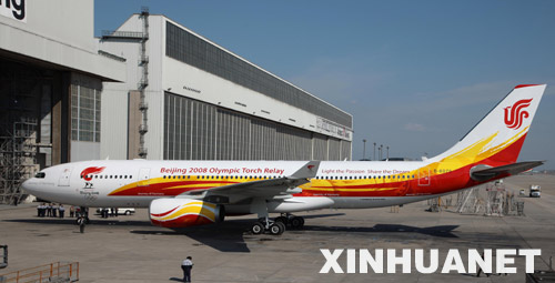 譚植洪介紹,“奧運圣火號”已于3月25日在北京飛機維修工程有限公司噴涂完成,并在3月28日進行了試飛。飛機機頭上,噴涂著一只燃燒的火炬,火炬下有兩個人在奔跑的圖案。
