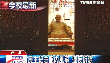 另據(jù)臺灣TVBS報道,“臺灣民主紀(jì)念館”里的300多支風(fēng)箏,將在今天晚上連夜拆除,288基金會表示,拆除風(fēng)箏后,大廳里不會只有蔣介石銅像,其它的空間規(guī)劃,準(zhǔn)備下星期公諸于世。而拆風(fēng)箏的過程,原本不準(zhǔn)任何媒體拍攝,但和綠營關(guān)系不錯的臺灣民視電視臺卻被允許拍攝。(高大林)