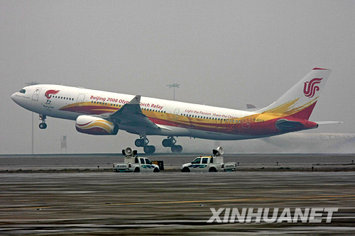 4月1日,“奧運(yùn)圣火號(hào)”飛機(jī)起飛。當(dāng)日,北京奧運(yùn)圣火搭乘專(zhuān)機(jī)離京,正式踏上以“點(diǎn)燃激情、傳遞夢(mèng)想”為口號(hào)的全球傳遞之旅。新華社發(fā)(魏萌攝)