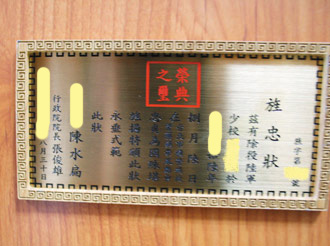 亡故臺軍的“旌忠狀”有“陳水扁”三字,令很多遺族無法向先人交代。(圖片來源:聯(lián)合報)