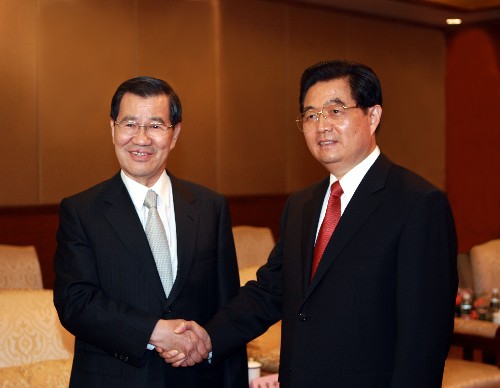 4月12日,中共中央總書(shū)記胡錦濤在海南省博鰲會(huì)見(jiàn)蕭萬(wàn)長(zhǎng)先生率領(lǐng)的臺(tái)灣兩岸共同市場(chǎng)基金會(huì)代表團(tuán)一行。 新華社記者鞠鵬攝