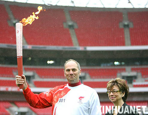 4月6日,在圣火傳遞起點――溫布利體育場,第一棒奧運火炬手、在1984-2000年間連續(xù)五次奪得奧運會賽艇金牌的雷德克雷夫(左)手持火炬展示。當日,北京奧運會圣火傳遞活動在英國倫敦舉行,這是北京奧運會圣火境外傳遞的第四站。新華社記者 謝秀棟 攝