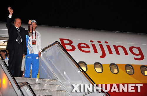 。保度樟璩苛銜r25分(北京時間16日凌晨3時25分),搭載圣火的專機降落在伊斯蘭堡軍用機場。當(dāng)北京奧運會火炬接力運行團隊總指揮、北京奧組委執(zhí)行副主席蔣效愚手持火種燈走下飛機時,現(xiàn)場響起了熱烈的掌聲。