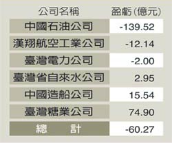 報(bào)道稱,臺(tái)灣“立法院財(cái)政委員會(huì)”昨天審查臺(tái)當(dāng)局2006年度總決算,“審計(jì)長(zhǎng)”林慶隆指出,臺(tái)當(dāng)局“經(jīng)濟(jì)部”主管包括臺(tái)糖、中船、中油、臺(tái)電、漢翔航空、臺(tái)灣省自來(lái)水公司等,但其中僅臺(tái)糖、中船、臺(tái)灣省自來(lái)水公司賺錢,其余中油、臺(tái)電、漢翔皆為虧損;中油虧損達(dá)139億余元最多,總計(jì)“經(jīng)濟(jì)部”掌理公營(yíng)事業(yè)共虧損60.2億多元。