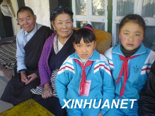 資料圖片:4月16日,次仁德吉(左二)、丈夫益西旺杰(左一)和兩個(gè)外孫女在一起。家住拉薩市城關(guān)區(qū)藏?zé)徉l(xiāng)加榮村的74歲藏族老阿媽次仁德吉在拉薩“3·14”嚴(yán)重暴力事件中,勇敢地救助了3名漢族群眾,在危難時(shí)刻體現(xiàn)出了藏漢團(tuán)結(jié)的民族之情。次仁德吉說(shuō):“藏漢就是一家人!我不能見(jiàn)死不救!”新華社記者 劉錚攝