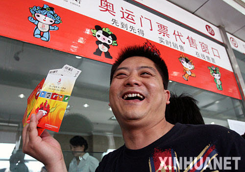 5月5日,在中國銀行阜陽分行奧運(yùn)門票代售點(diǎn),一名市民展示剛購買的奧運(yùn)門票。當(dāng)日,北京奧運(yùn)會(huì)第三階段門票銷售正式啟動(dòng)。由于這一階段采取“先到先得”的售票原則,公眾購票熱情十分高漲。 新華社發(fā)