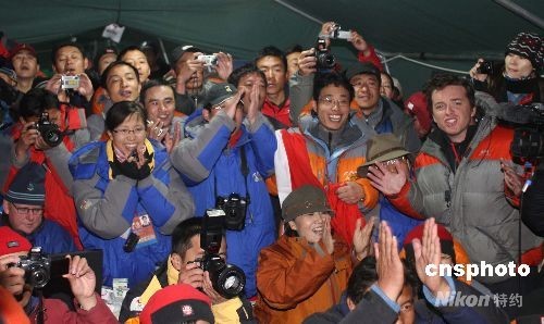 5月8日,北京奧運圣火成功登頂珠峰,在珠峰大本營內(nèi)觀看直播的中外記者以及工作人員興奮異常。 中新社發(fā) 盛佳鵬 攝