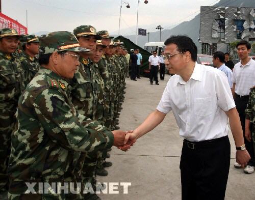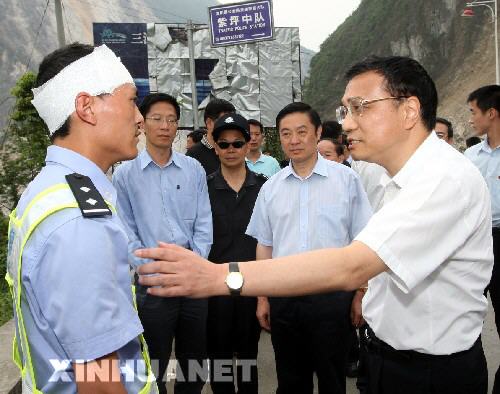 5月20日,中共中央政治局常委、國務(wù)院副總理、國務(wù)院抗震救災(zāi)總指揮部副總指揮李克強繼續(xù)在四川地震災(zāi)區(qū)指導(dǎo)抗震救援工作。這是李克強在地震中心區(qū)的汶川縣漩口鎮(zhèn)友誼隧道附近看望負(fù)責(zé)道路搶修維護(hù)的成都武警交通第一總隊官兵。 新華社記者蘭紅光攝